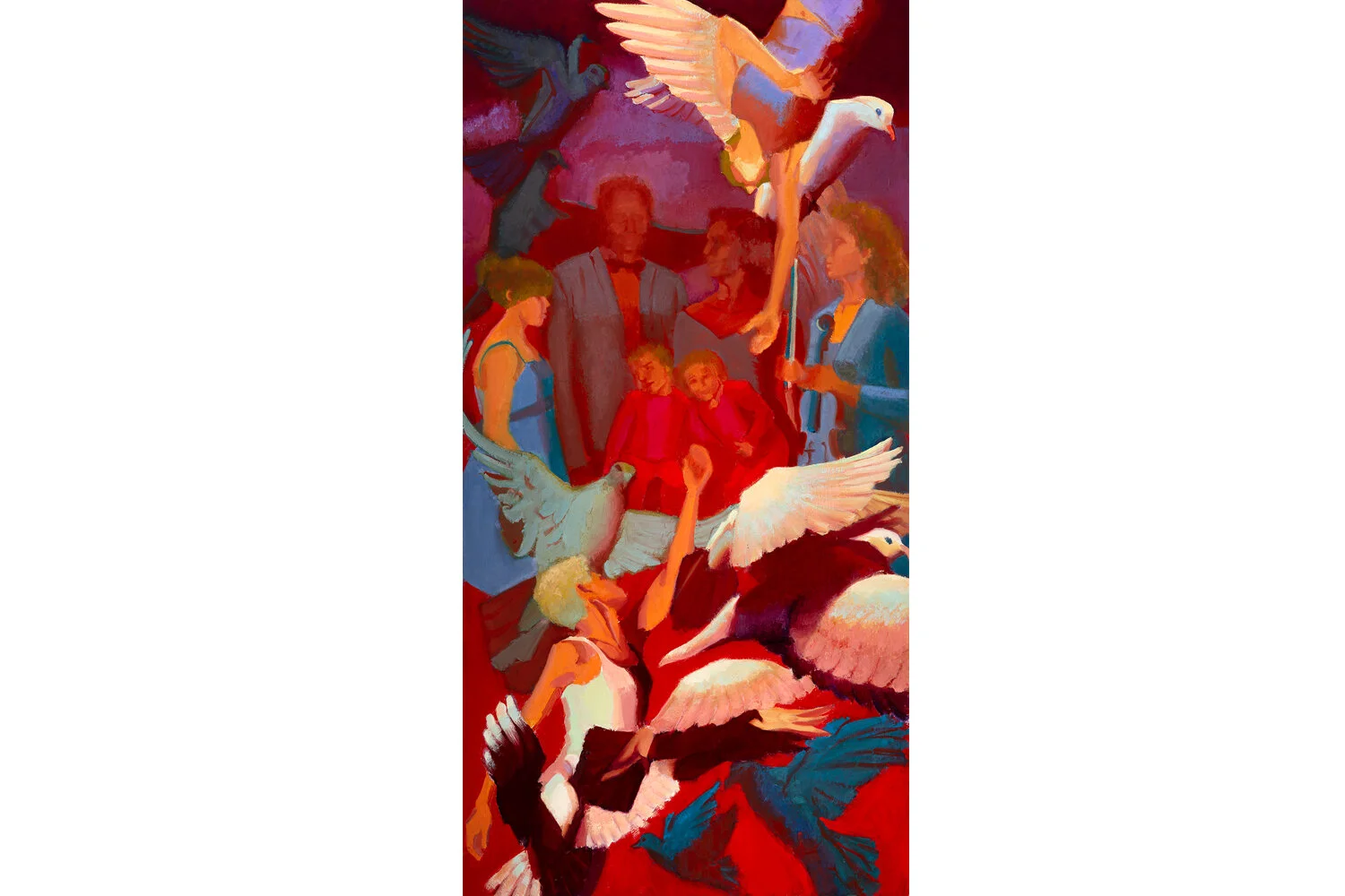 Birds are a fitting avatar for me, the daughter wandering Jews, of parents who moved away from parents who moved away from parents. The particular birds in these paintings are humble pigeons, crows, and doves. They are thought to be nothing special, or even pests, but they have miraculous qualities. Crows in particular are much maligned, but have remarkable intelligence and empathy. They form loyal, long-term partnerships, and travel in large family groups. Like birds, my flying people move as individuals and as a group, always together and always separate. We let go and hold on, our personal comings and goings governed by universal forces and geometry. The shapes of our movements create layers of space that create layers of time, in an unchanging cycle of lives arising and disappearing.